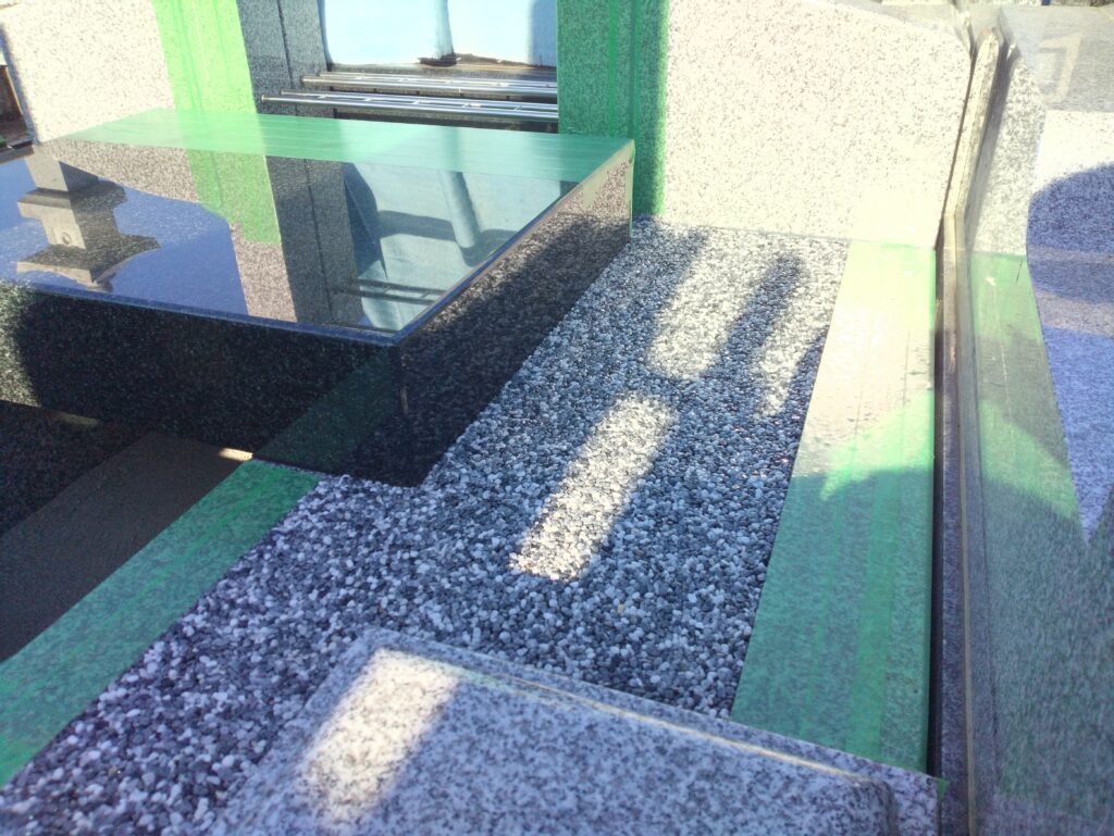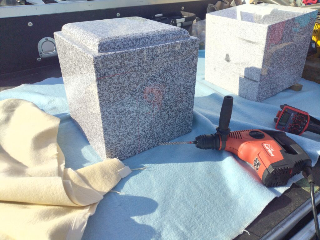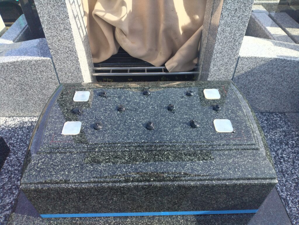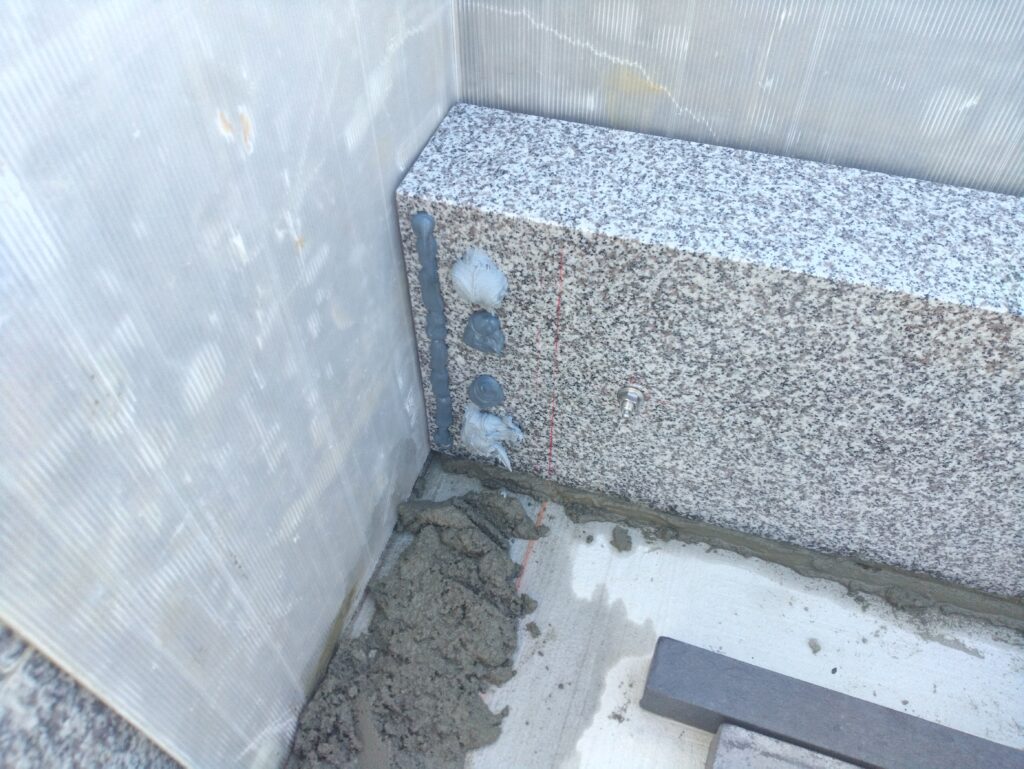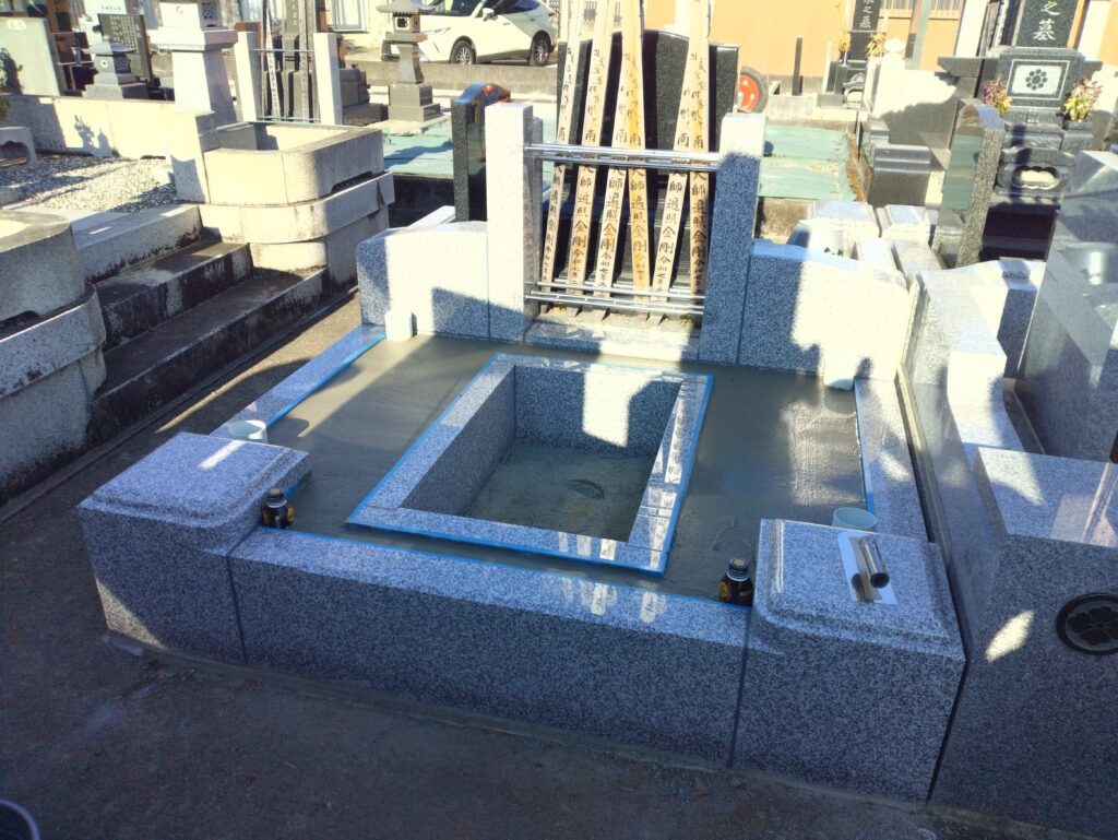 コンクリート打設し数日間の養生の後、入荷したお墓の部材を自社検品し、お墓の据え付け工事に移っていきます。