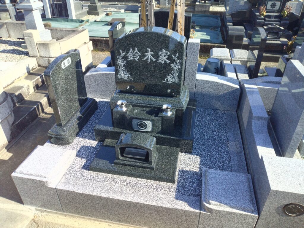 墓石にはインド産黒系石材の中でも実績と美しさで名高い「M1-H黒口」を使用。深い黒緑色が墓所の格調を引き立てます。