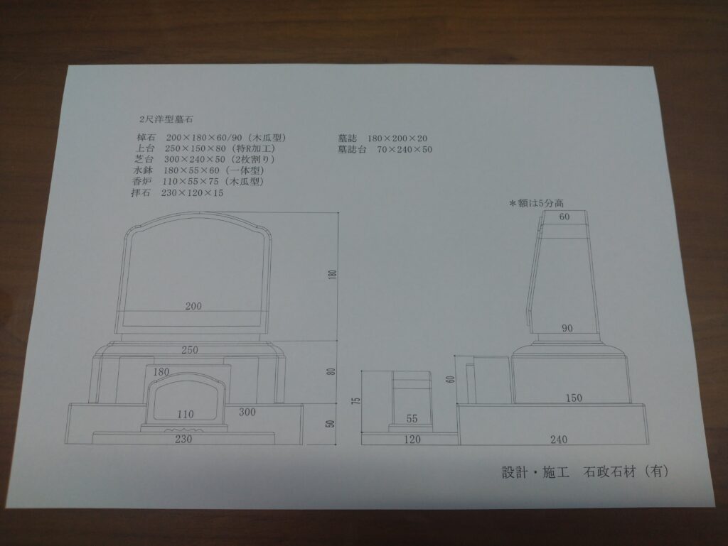お施主様には多くの実際に建っているお墓を見学していただき、弊社提案の数種類の図面の中から「シンプルかつ全体の統一感を持たせたR加工」を取り入れた優美なデザインをお選びいただきお見積りし、契約となりました。